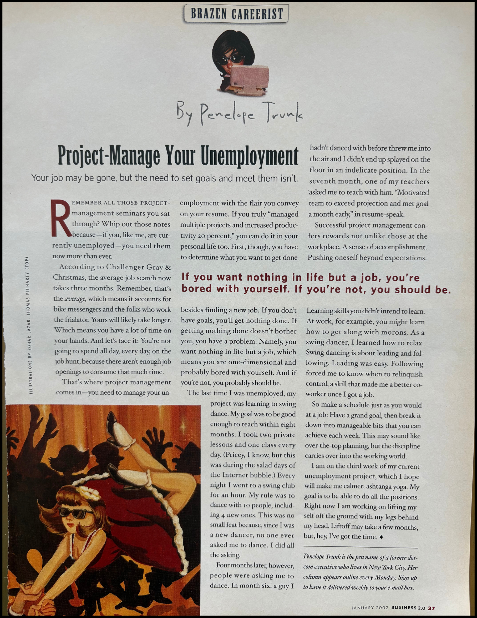After 9/11 I didn’t go back to a regular job, so the columns shifted to other parts of my life. This one is about being unemployed. At the time, unemployment was supposed to mean failure. To me it felt like a break after 80-hour weeks at a startup.