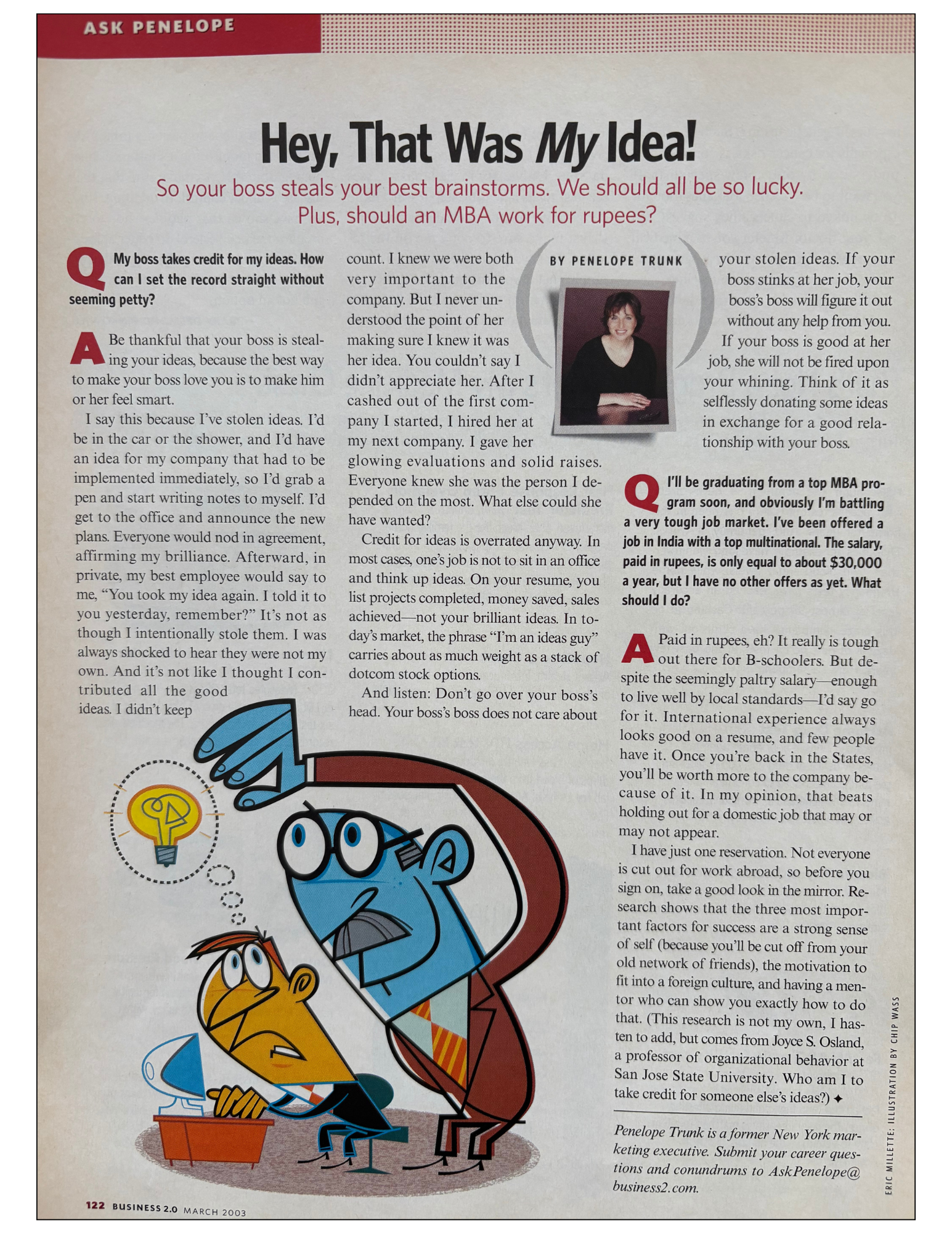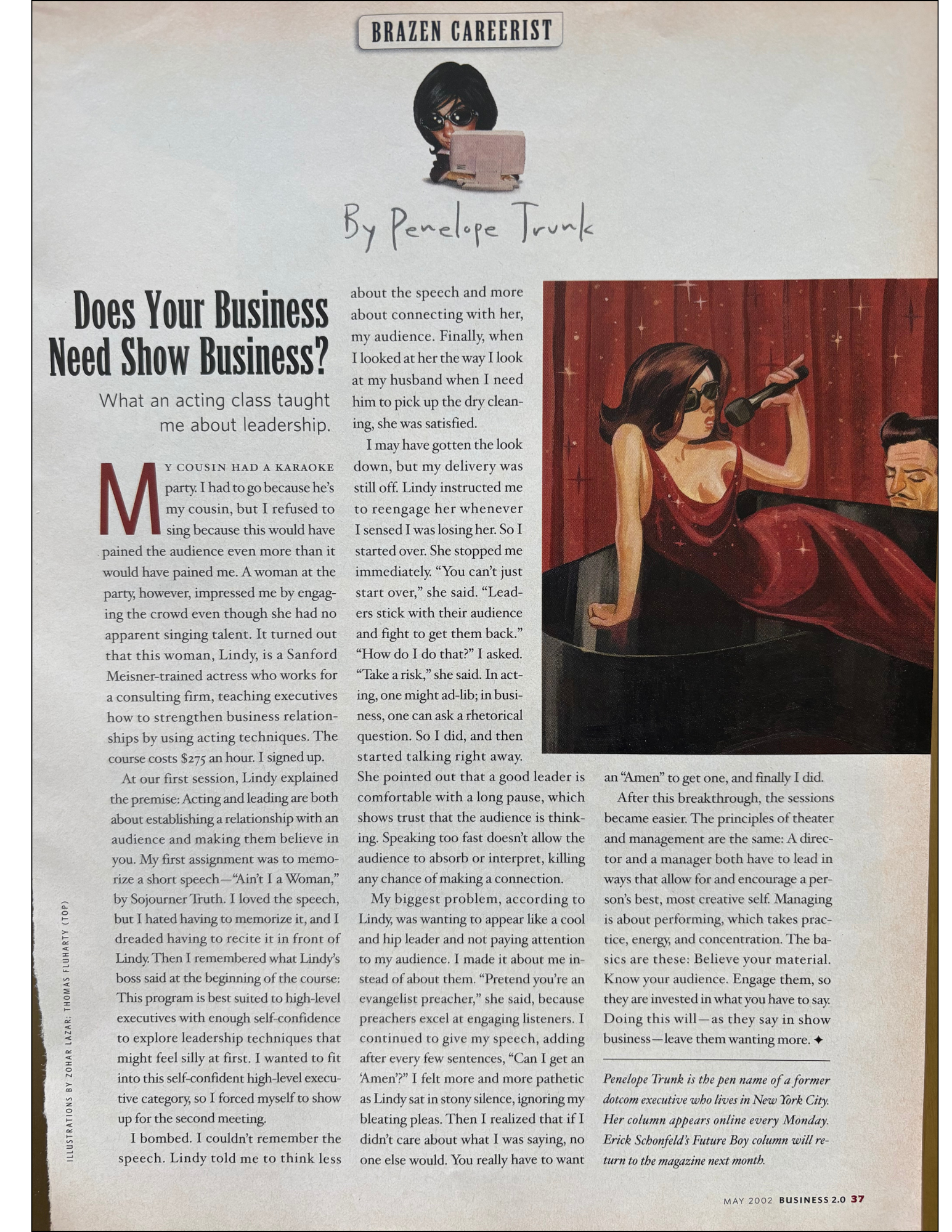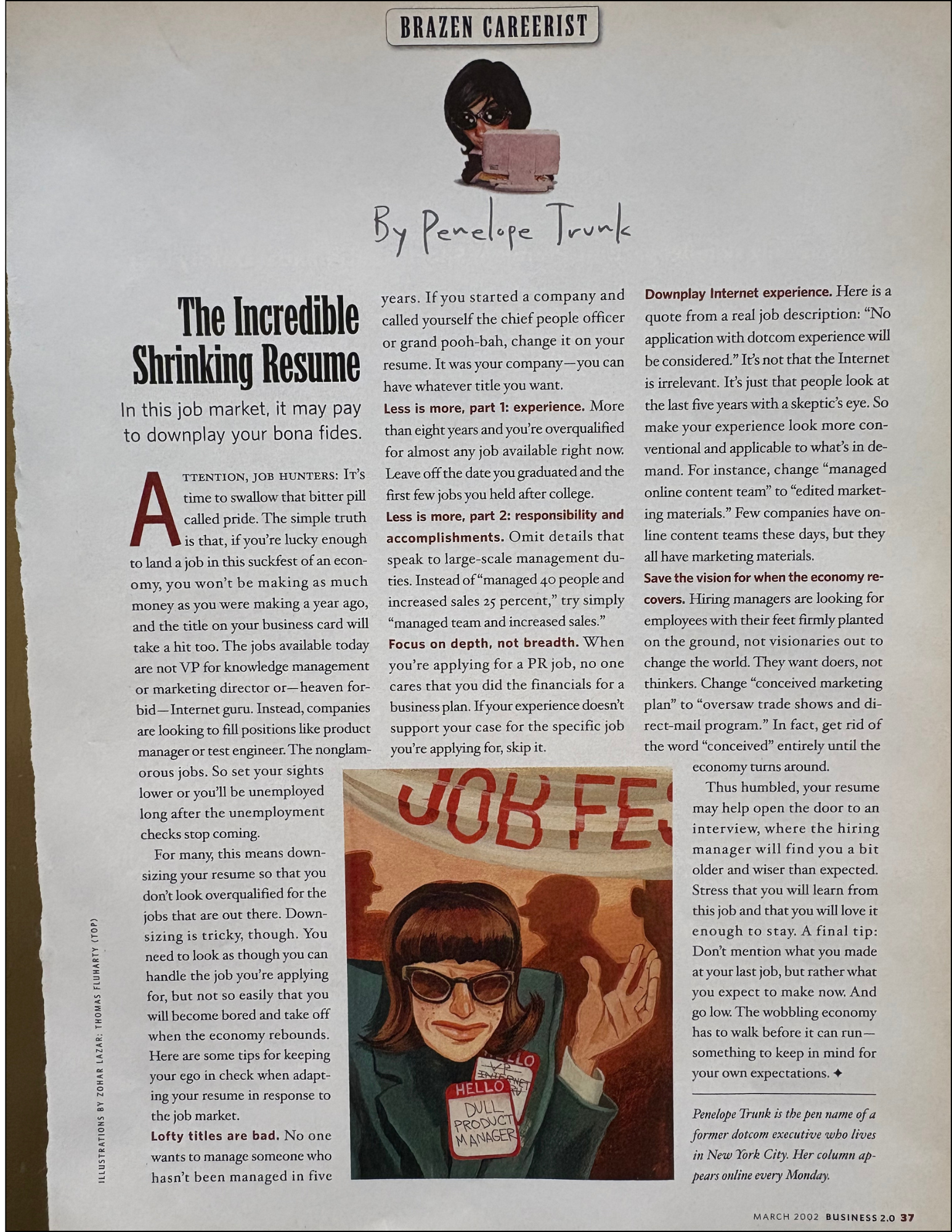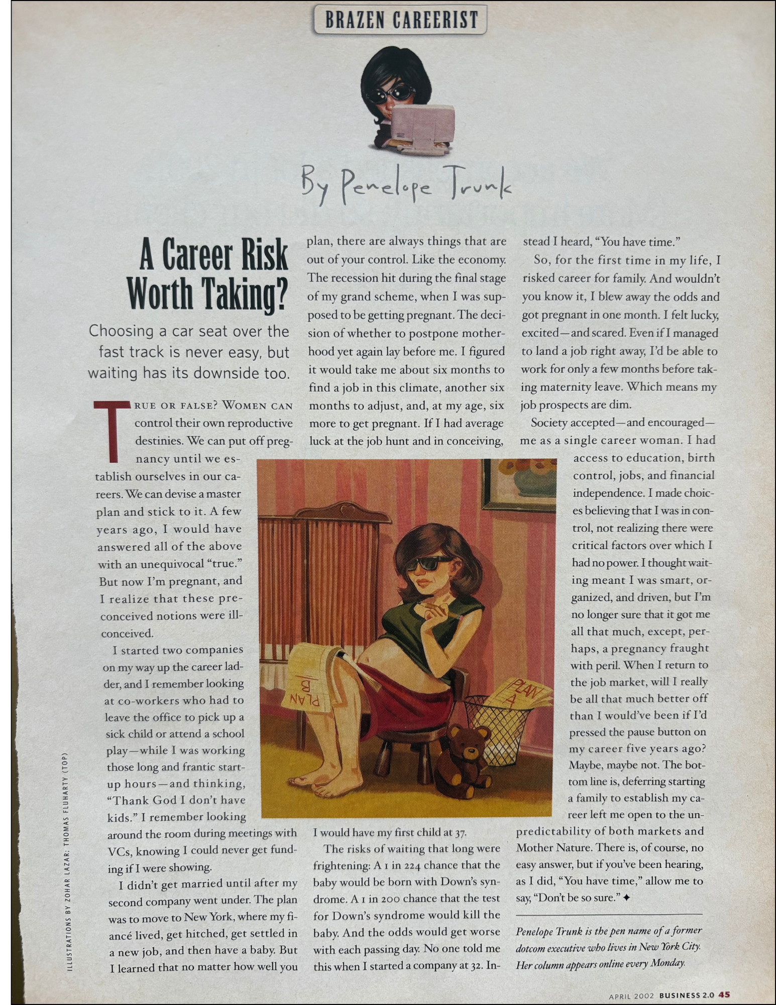 You can see it happening on the pages. My bio changes. The illustrations change. The column itself changes. At one point, after I had the baby, the managing editor told me I should start writing for women’s magazines. In another issue my bio calls me a “former” executive, as if my career were already over.