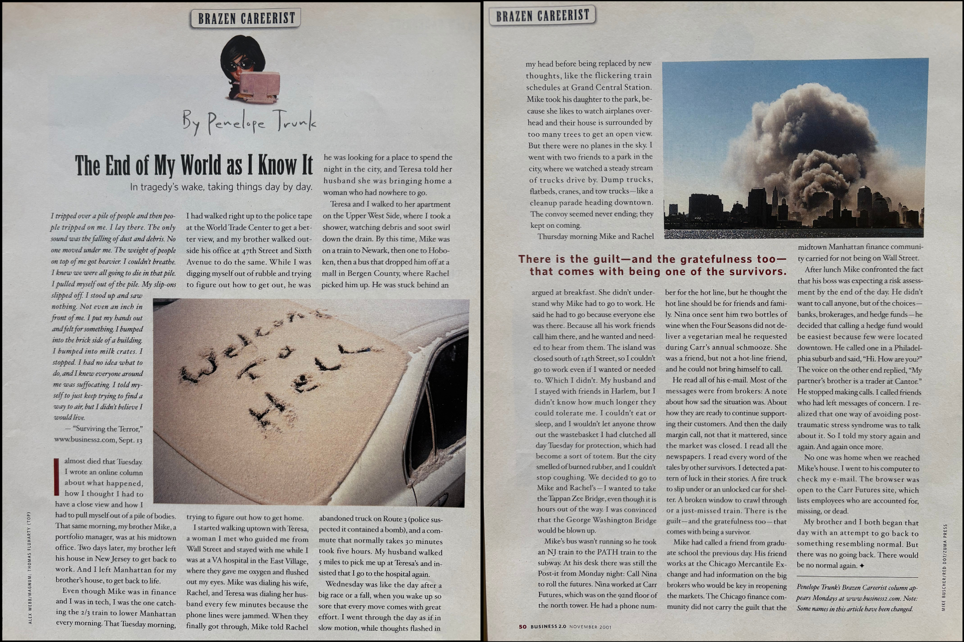 This was such a raw and powerful read. It’s incredible how clearly you see the patterns looking back—the magazine slowly reshaping your story, and how you went along with it because you’d already learned to not say the true thing. The detail about the bio calling you a “former executive” the first day you didn’t go back after 9/11 really got to me.